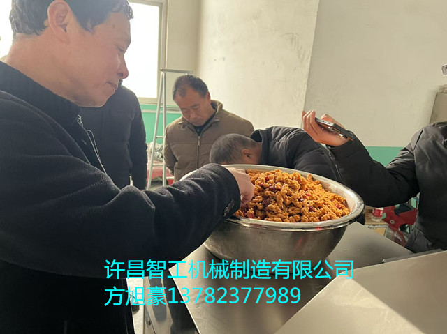 现场开机5-4型电磁炒货机加热炒制,许昌智工电磁炒货机控温精准拌料均匀,加热迅速,炒制效果客户非常满意。